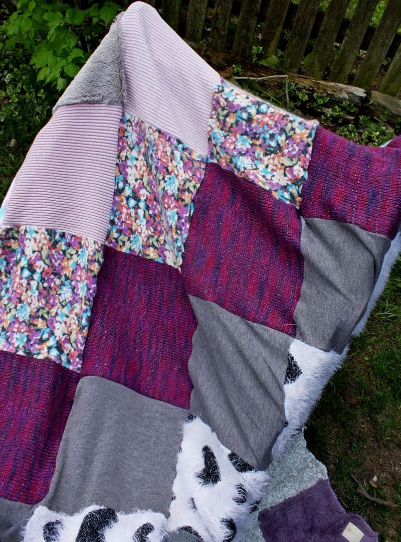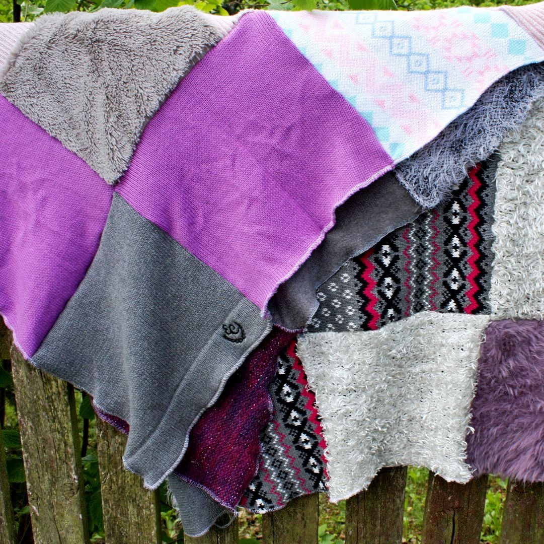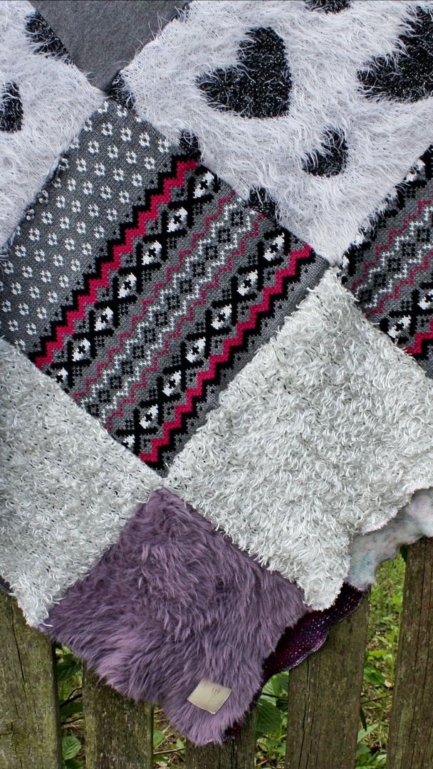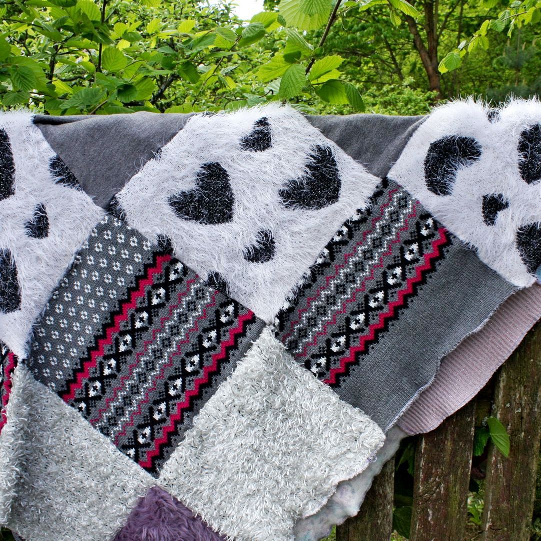cały patchworkowy koc w pastelowych kolorach rozwieszony na sznurze