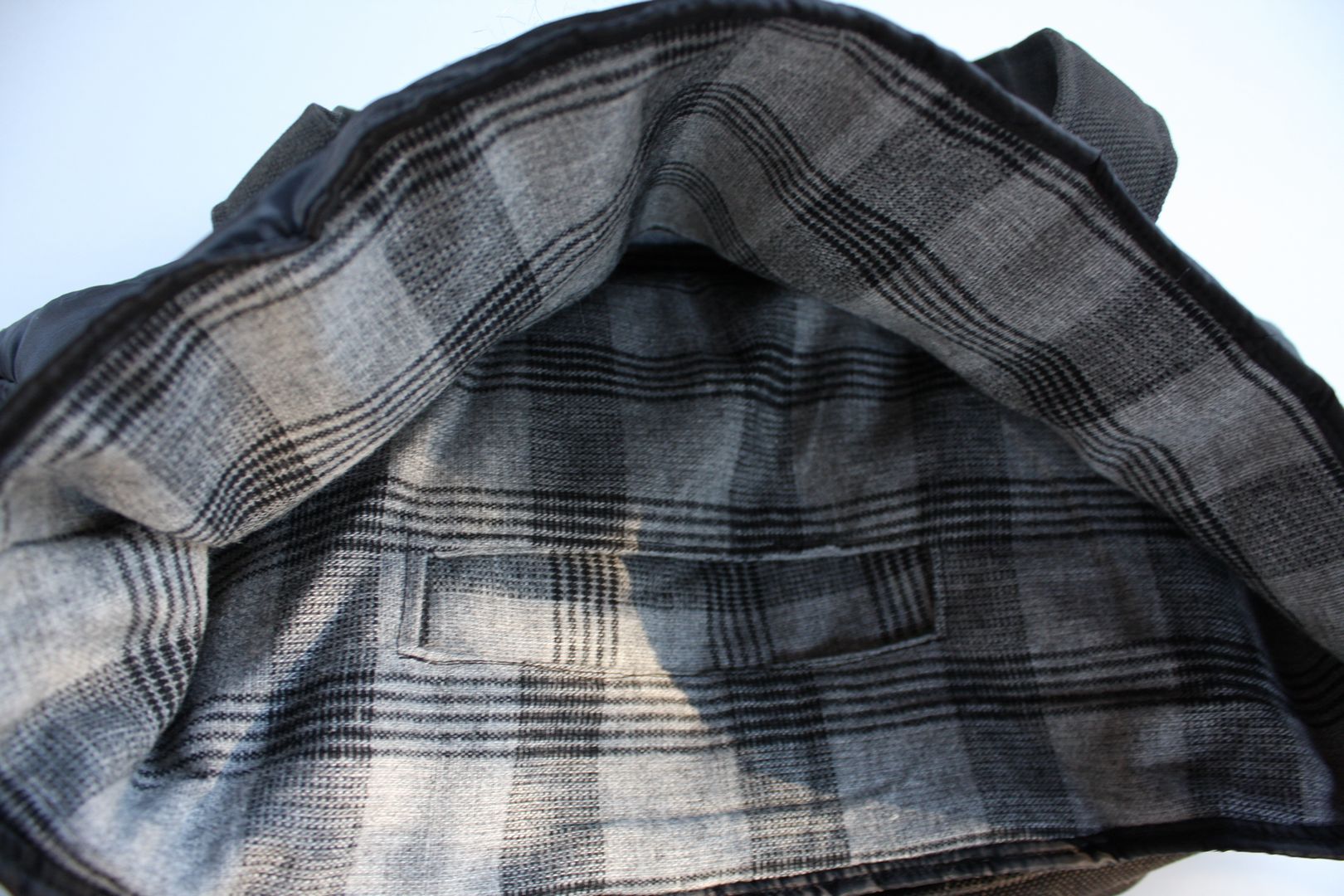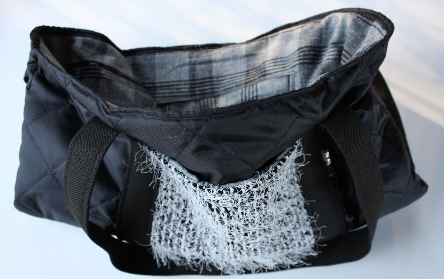 Nietypowa szoperka powstała z połączenia tkaniny obiciowej bahama, pikowanej kurtki, kawałka szarej wełny z lat 70 i bluzeczki w nietypowy biały „kłaczek”. Efekt prezentuje się całkiem przyjemnie, przytulnie i idealnie wpasowuje w zbliżające się zimowe klimaty 😀