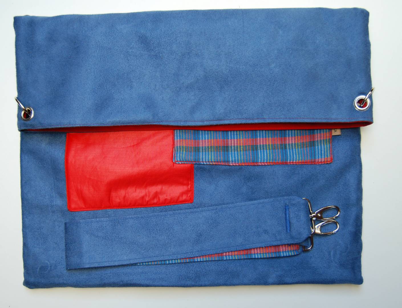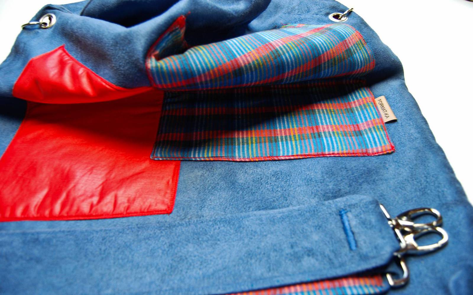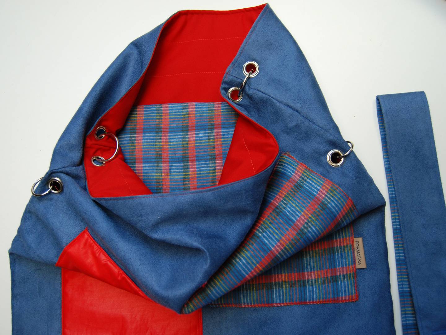 „Patka-Kratka” to nie tylko jedno z najwyrazistszych połączeń kolorów. Na zewnątrz alkantara w głębokim niebieskim kolorze. Wewnątrz nadająca formę ortalionowa wodoodporna pikówka pikowana w pasy w boskim kolorze czerwieni. Wewnętrzna kieszeń – bawełna w kratkę (znana Wam skąd inąd z „Matki-Kratki” ). Zewnętrzna: też ta bawełna i zdobyty kawałek materiału zupełnie nieznanego mi rodzaju, przypominający z wyglądu trochę cieni ortalion, w krwistym, energetycznym kolorze czerwieni.