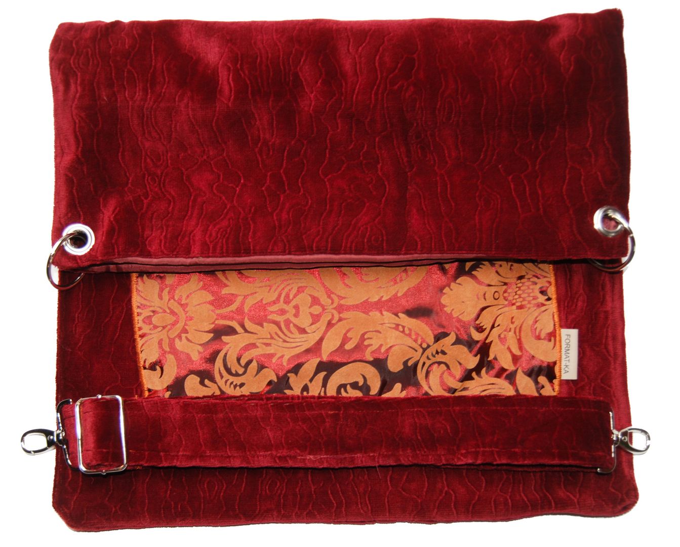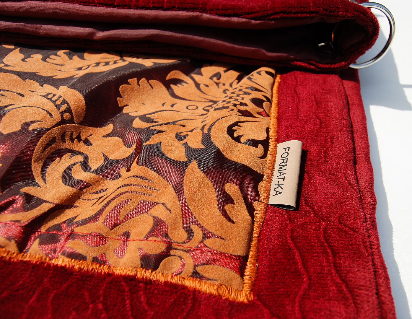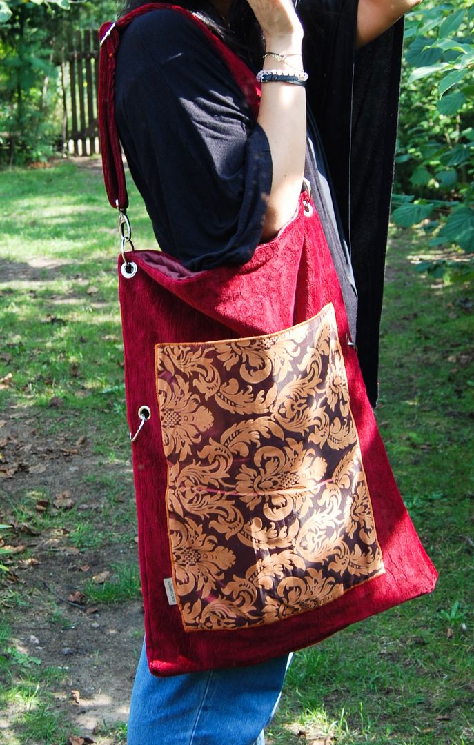 Na zewnątrz torebki bardzo gruba i mięsista tkanina obiciowa przypominająca plusz z nietypową fakturą w podłużne linie i kieszeń z bordowej połyskującej serwety ze złotym ornamentem. Wewnątrz bordowa pikówka. Tak właśnie wygląda Rubinowa Królowa. Dwa komplety kółek do wpięcia regulowanego paska uszytego z materiału z zewnętrza torebki. Solidna, konkretna i piękna.